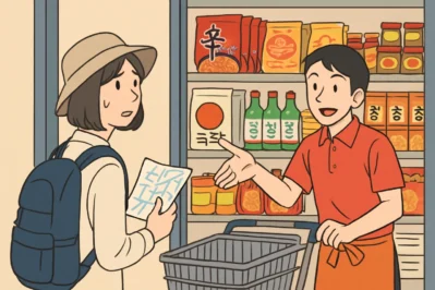 Let’s see how these phrases work in a real conversation at a big Korean mart! Alex is a tourist who wants to buy some snacks seen in a K-drama.